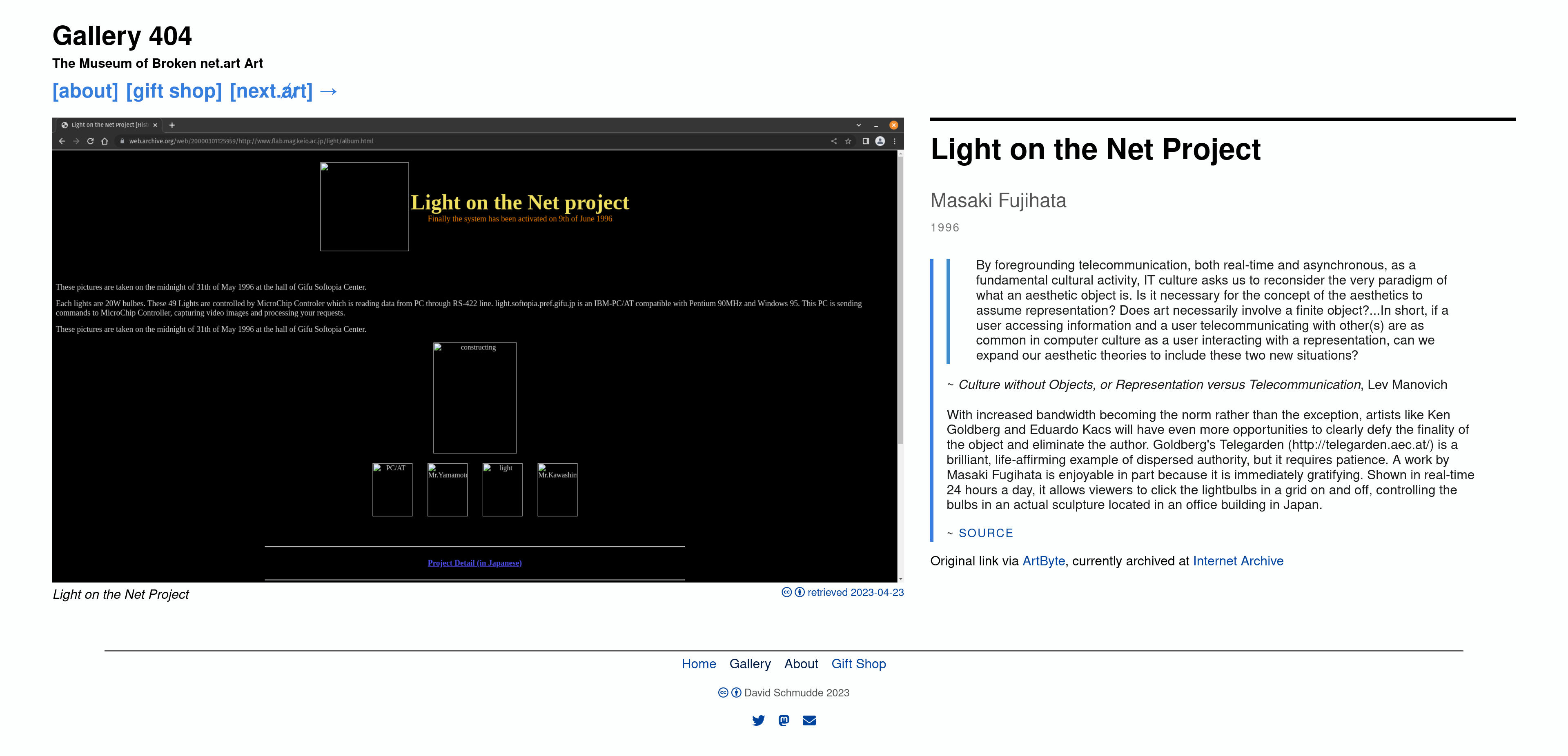 Consider Gallery 404, a museum of obsolete digital art . None of these art works are reproducible any longer. Server’s go down. Domains expire. Adobe flash is long gone.