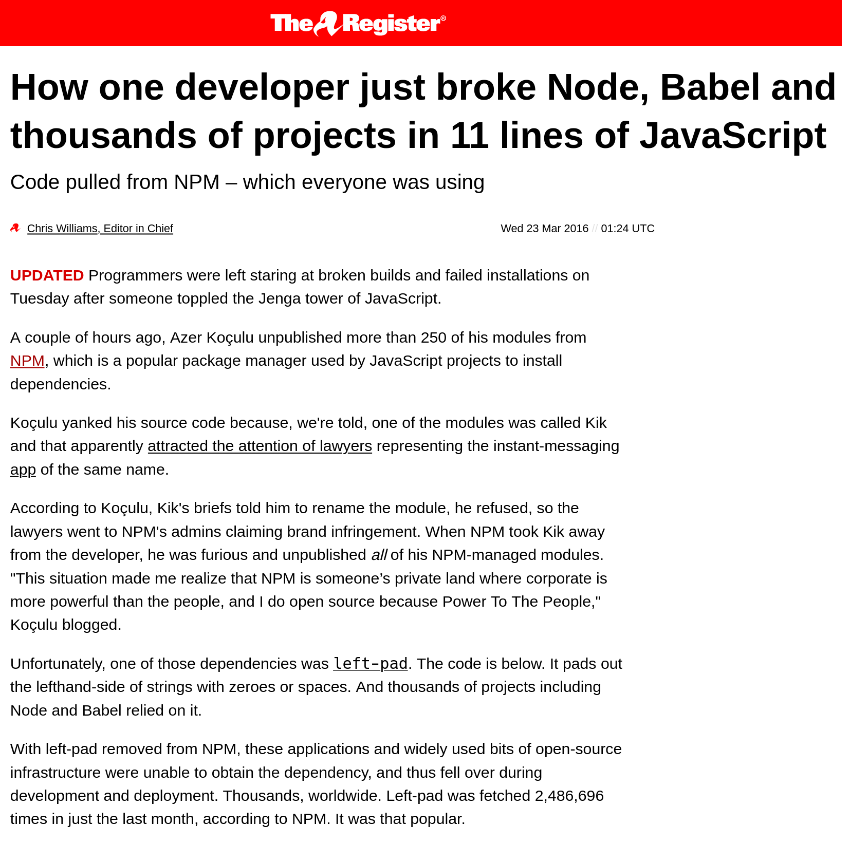 Consider the tale of Leftpad… not even a dozen lines of JavaScript was removed from NPM in 2016. It brought front-end development to a screeching halt as build failures cascaded across the web.