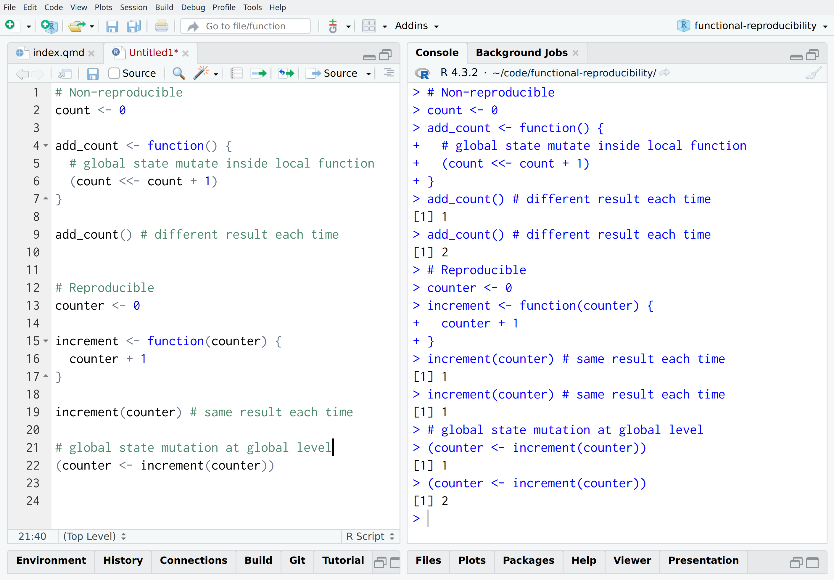 The code on this slide has essentially the same functionality as before but because it’s now reproducible it’s much easier to reason about. We’ve made the dependency on the context explicit rather than implicitly relying on global state. The focus of the function is on the value of the count, not the variable and it’s place in memory.